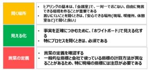 前回もお伝えしましたが、ホワイトボードなどで「見える化」しながらヒアリングをすることで、事実誤認を防ぐことができます。また書きながら上手く整理できないところは、何か問題が潜んでいる可能性があります。