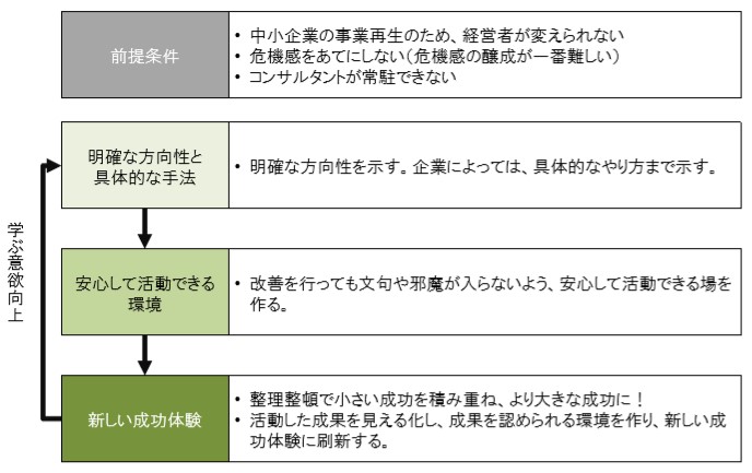 支援に当たっては「中小企業のため、経営者が変えられないこと」「危機感をあてにしないこと」「コンサルタントが常駐できないこと」を前提条件として取り組みました。