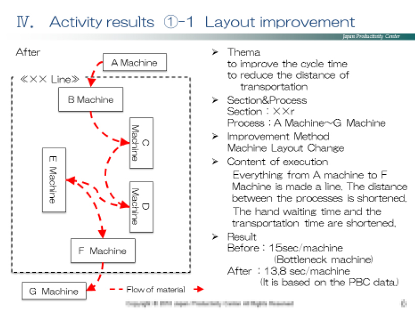 県再生支援協議会からのご依頼で、工場診断、計画策定、生産機能の問題点・課題の抽出、アクションプラン、コストダウン効果の算出を行いました。別のコンサルタントがB/S、C/Fに反映し、その後、現場改善支援で半年間支援でコストダウンを実現しました。